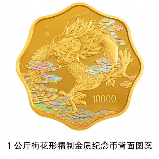 1公斤梅花形金质纪念币为精制币,含纯金1公斤,外接圆直径100毫米,面额10000元,成色99.9%,最大发行量118枚。