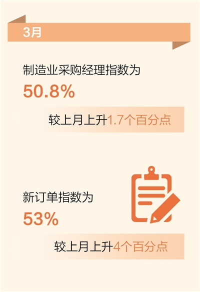 3月,随着更好支持扩大内需,促进稳外贸稳外资等政策稳定发力,经济内生动力不断释放,同时外部需求也有所改善,市场需求较好增长。新订单指数为53%,较上月上升4个百分点,升幅较为明显;新出口订单指数为51.3%,较上月上升5个百分点,回到扩张区间。