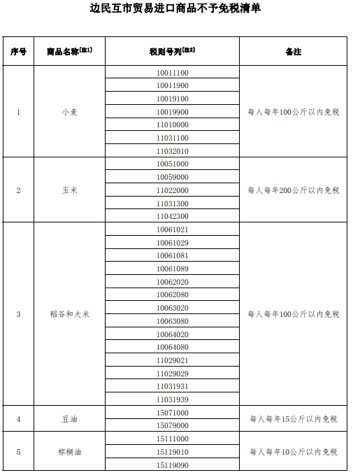 《通知》明确,除《边民互市贸易进口商品负面清单》所列的商品外,边民均可通过互市贸易方式进口。边民互市贸易进口商品不予免税清单共21项商品,包括烟、酒等,以及超出规定数量的小麦等农产品。进口免税额度以个人为单元计算和使用。边民互市贸易出口商品不予免税清单包括国家禁止出口的商品、应征收出口关税的商品和取消出口退税的商品。今后,财政部将会同有关部门根据边民互市贸易发展的实际情况,适时动态调整边民互市贸易进出口商品不予免税清单。
