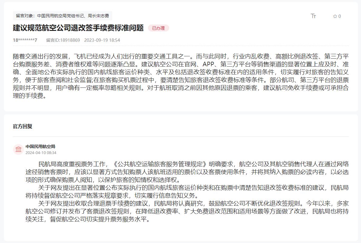 民航局依托“领导留言板”平台,了解群众呼声,及时对网友关切作出积极回应。回复中表示,民航局对网民提出的建言逐条认真研究,积极采纳合理建议,鼓励航空公司不断优化退改签规则,督促航空公司切实提升票务服务水平,稳步推进行程单电子化试点改革工作。